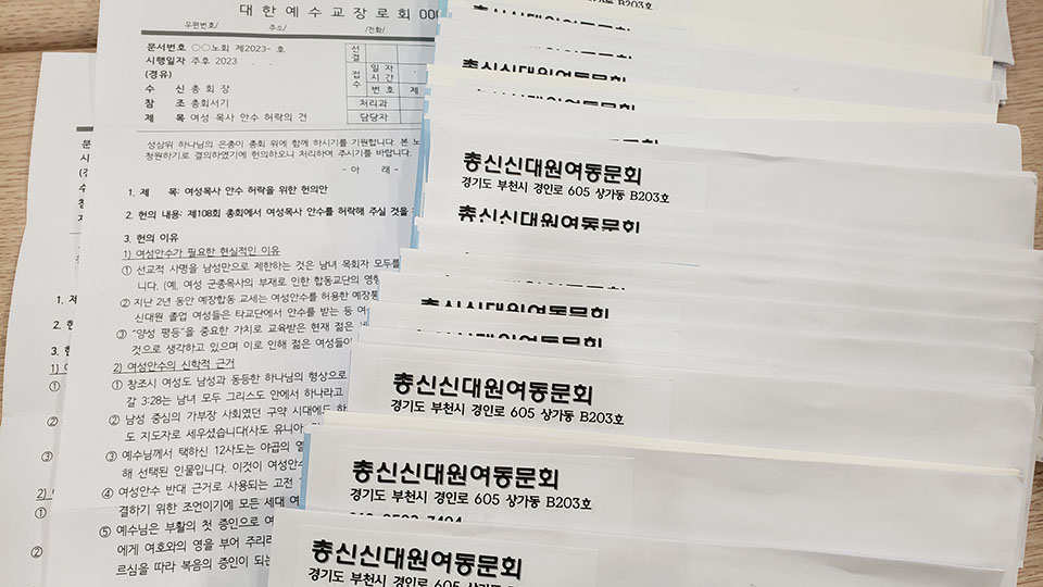 [뉴스앤조이-구권효 기자] 총신대학교 신학대학원 여동문회(이주연 회장)가 3월 13일 대한예수교장로회 합동(예장합동·권순웅 총회장) 전국 157개 노회에 '여성 안수 헌의안을 발의해 달라'는 우편을 발송했다. 예장합동을 비롯한 장로교단은 봄과 가을에 열리는 정기노회에서 발의한 헌의안을 매년 9월 총회에서 논의한다. 여동문회는 이번 봄 정기노회를 맞아, 각 노회가 총회에 여성 안수 도입을 헌의해 달라고 요청한 것이다.