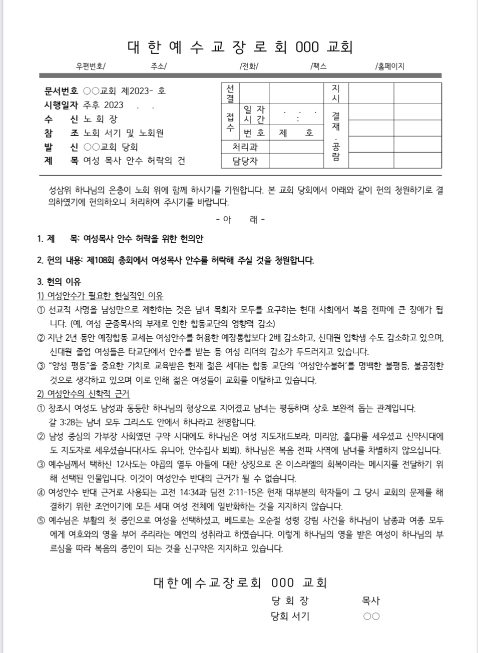 편지와 함께 헌의안 초안도 첨부했다. 헌의안에는 '여성 안수가 필요한 현실적인 이유'와 '여성 안수의 신학적 근거'가 적혀 있다. 현실적인 이유는 여성 리더십 부재와 젊은 여성들의 교회 이탈 등 교세 감소였고, 신학적 근거는 성경 곳곳에 나타나는 여성과 남성을 차별 없이 대하시는 하나님·예수님의 속성이었다.