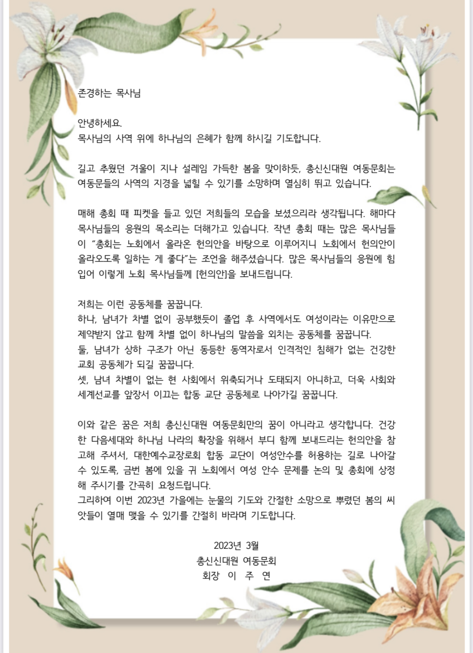 여동문회는 편지글에서 △남녀가 차별 없이 공부했듯이 졸업 후 사역에서도 여성이라는 이유만으로 제약받지 않고 함께 하나님의 말씀을 외치는 공동체를 꿈꾼다 △남녀가 상하 구조가 아닌 동등한 동역자로서 인격적인 침해가 없는 건강한 교회 공동체가 되기를 꿈꾼다 △남녀 차별이 없는 현 사회에서 위축되거나 도태되지 않고 더욱 사회와 세계 선교를 앞장서 이끄는 예장합동 교단 공동체로 나아가길 꿈꾼다고 했다.