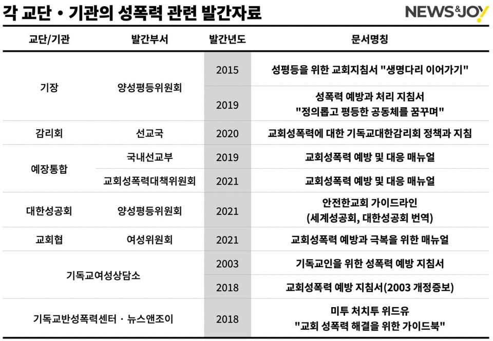 교단·기관별로 발간 부서와 발간 시기 등에 차이가 있고 정식 문서명도 다르지만, 운동 주체들은 이미 '미투 운동'이 일어나기 훨씬 전부터 기독교 내 성폭력 문제에 관해 지속적으로 연구하고 문제 제기해 왔습니다. 저는 이 문헌 자료들을, 사회 여성운동과 함께 공명하면서도 기독교 현장에 맞는 정책과 지침을 고민해 왔던 치열한 '역사적 산물'로 봅니다. 우리보다 훨씬 앞선 해외 교단들의 성폭력 정책을 연구하고 사회 법과 사회 여성운동 담론들까지 다양한 자료와 정책을 망라해 발간한 지침서를 배포·홍보하는 일은 척박한 운동에 활기를 더해 주는 단비 같은 실천들이었을 겁니다.