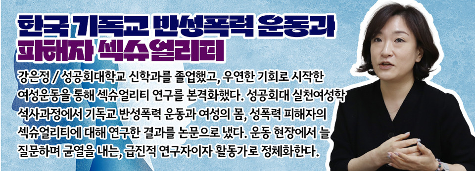 '한국 기독교 반성폭력 운동과 피해자 섹슈얼리티'는 대한성공회 양성평등위원회 전문위원이자 안양나눔여성회 사무국장으로 일하는 강은정 활동가의 연재입니다. 한국 기독교 반성폭력 운동의 전개 과정과 맥락을 살피고, 앞으로 나아가야 할 방향을 제안합니다. - 편집자 주 |