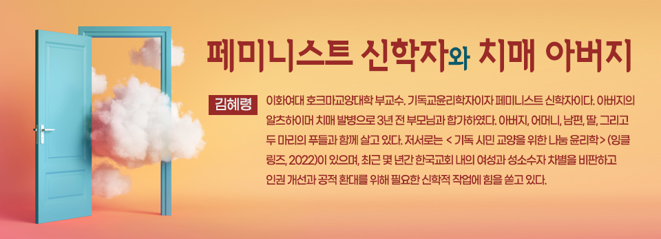 | 이화여자대학교 호크마교양대학 김혜령 부교수가 '페미니스트 신학자와 치매 아버지'를 주제로 연재를 시작합니다. 연재는 격주 월요일 발행합니다. - 편집자 주 |