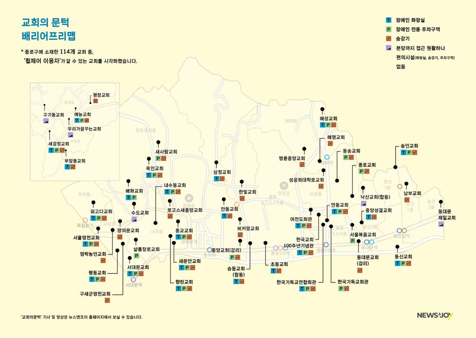 종로구 교회들의 배리어 프리 현황을 취재하면서, 편의 시설 부족은 결국 인식 문제라는 결론에 도달할 수 있었다. 바꿔 말하면, 거동이 불편한 장애인들은 '예배당 시설'과 '교인들의 인식'이라는 두 가지 문턱을 느끼고 있다는 것이다. 편의 시설이 되어 있지 않은 곳은 장애인이 애초에 접근할 수가 없었고, 편의 시설이 있어 예배를 드릴 수 있다 하더라도 장애인이 공동체의 일원으로 받아들여지고 있는지는 다른 차원의 문제였다.