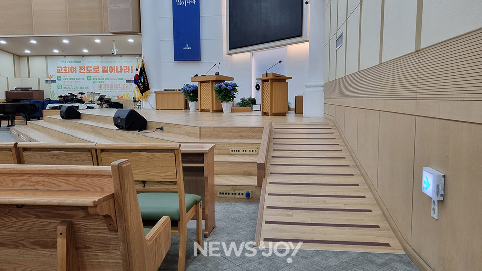예배당 2층 본당 맨 뒤편에 휠체어석이 마련돼 있었다. 바닥에 장애인 마크가 크게 그려져 있어 눈에 띄었다. 본당 뒤에서 강단까지는 경사로로 내려가게 돼 있었다. 하지만 강단에는 계단이 있어 휠체어 사용자가 올라갈 수 없었다.