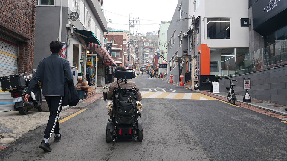 너무나 일상적인 것처럼 보이는 이 모습을 휠체어 이용자의 시선으로 보면, 장면 하나하나에 '문턱'이 있지는 않은지 걱정해야 한다. '장애인·노인·임산부 등의 편의 증진 보장에 관한 법률(장애인등편의법)' 기준에 따르면, 휠체어 이용자가 원활하게 다니기 위해서는 높이 차이가 3cm 이내여야 한다. 단 3cm 이상의 문턱 하나만 있어도, 이들은 누군가처럼 '일상'을 누리지 못한다.