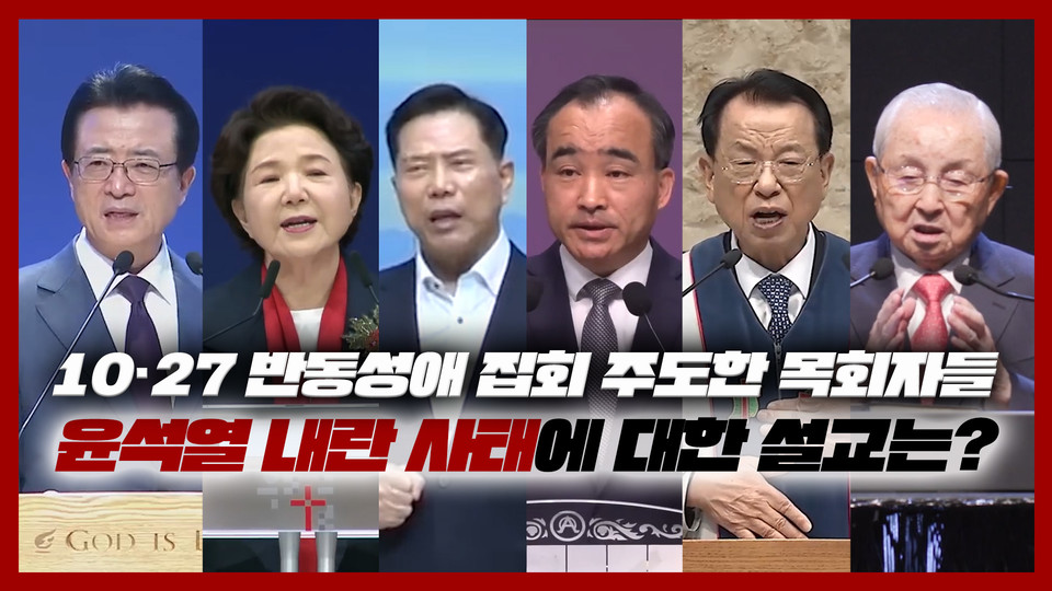[뉴스앤조이-경소영 PD] 윤석열 대통령의 비상계엄으로 촉발된 내란 사태가 점점 심각한 상황으로 치닫고 있다. 현 시국에 대해 10·27 반동성애 집회를 주도한 목회자들은 어떤 말을 했을까. 비상계엄 이후 그들의 주일 설교를 살펴봤다. 10·27 집회 실행위원장 손현보 목사(세계로교회), 10·27 집회 공동대회장 오정현 목사(사랑의교회), 10·27 집회 설교자로 나선 김양재 목사(우리들교회), 박한수 목사(제자광성교회) 그리고 윤석열 대통령의 '교계 멘토' 역할을 했던 김장환(극동방송 이사장)·김삼환(명성교회 원로) 목사의 설교를 모았다.
