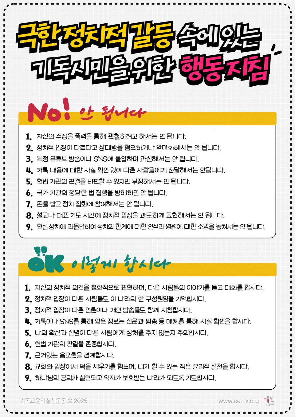 이용필 / 이번에 기독교윤리실천운동이 사회가 극한 정치적 갈등 속에 빠져드는 것을 우려하면서 기독 시민을 위한 행동 지침을 발표했는데요. 이 지침을 두고 혹자는 나이브하고 과연 이념에 경도된 이들이 무슨 행위를 하면 안 된다거나 무엇을 해야 한다는 이야기에 귀를 기울이겠느냐고 비판하기도 했는데요.