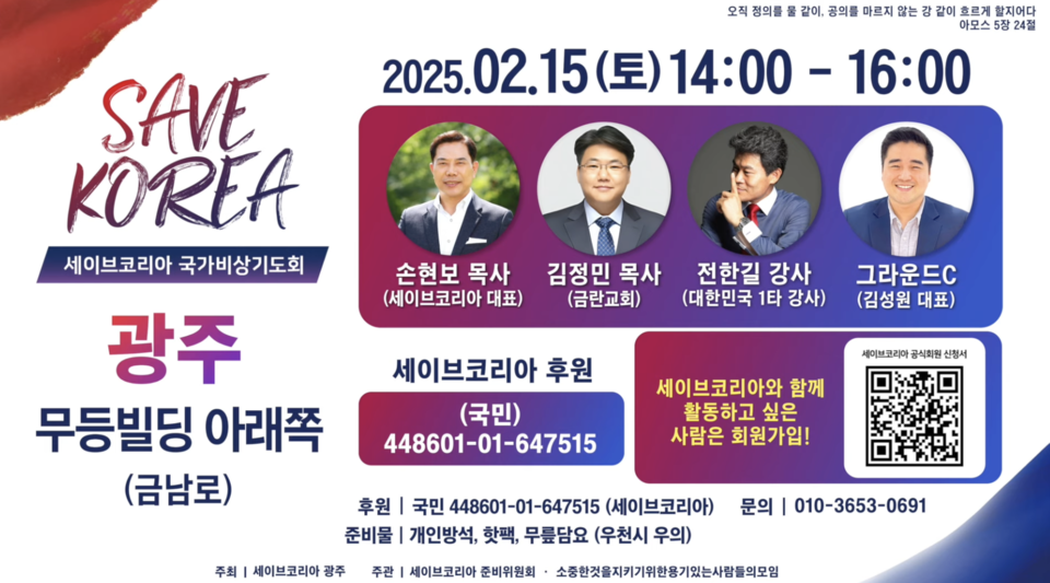 매주 토요일 전국을 순회하며 탄핵 반대 집회를 열고 있는 세이브코리아는 15일 광주에서도 탄핵 반대 집회를 열 계획이다. 광주교회협은 세이브코리아의 광주 집회를 두고 "내란 수괴를 비호하는 극우 집회는 하나님의 공의와 진리를 향한 믿음으로 1980년 5월 전두환 신군부의 계엄에 맞서 목숨을 걸고 분연히 일어섰던 광주 시민들과 광주 기독인에 대한 모독이고, 2차 가해"라면서 "무엇보다 불의한 정치 세력을 비호하기 위하여 여호와 하나님의 이름을 내세우는 것은 성경의 가르침에 정면으로 위배되는 것"이라고 규탄했다.