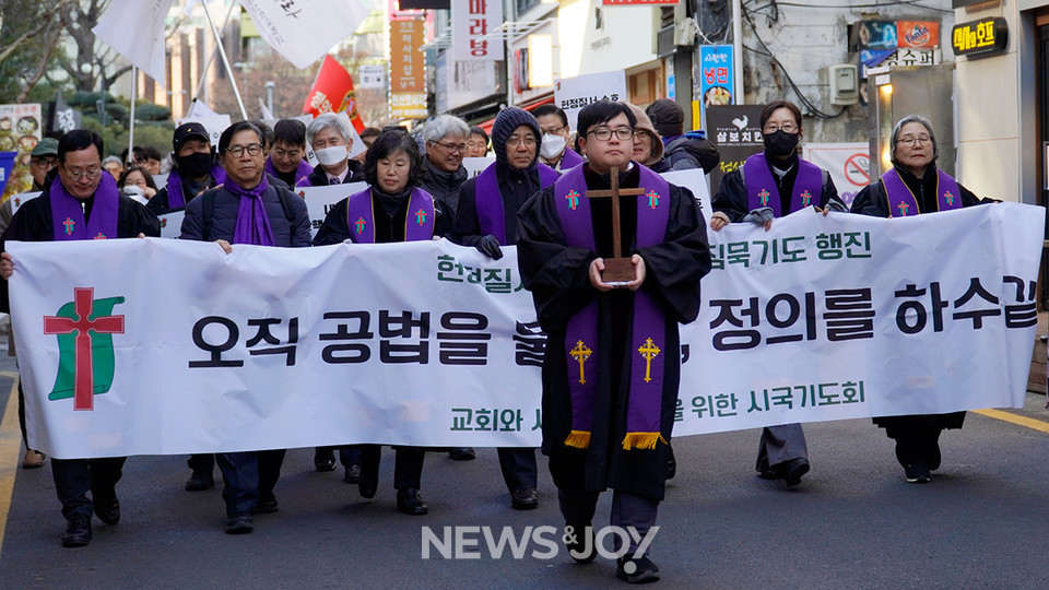 [뉴스앤조이-안디도 기자] 대한예수교장로회 통합(예장통합·김영걸 총회장) 목회자들이 비상계엄 이후 처음으로 '교회와 사회 대전환을 위한 시국 기도회'를 열었다. 예장시국기도회준비위원회 주최로 2월 20일 열린 기도회에는 예장통합 목회자 150여 명이 모여 윤석열 대통령과 극우 개신교 세력을 규탄했다.