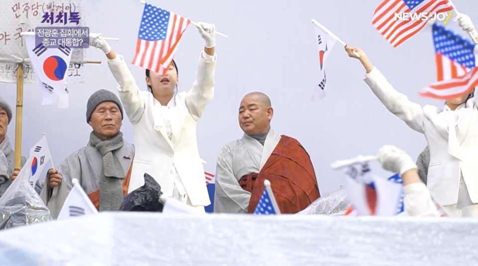 광화문하고 여의도 집회에는 각종 인사들 나오잖아요. 그런데 광화문 집회 중에 특징 중에 하나는 종교 대통합이거든요. 스님들도 올라오잖아요. 네 맞습니다. 스님도 막 올라와서 막 할렐루야 외치고 막 그러거든요. 좀 이번에도 스님들 나왔나요?