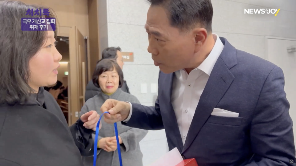 ◇ 엄태빈 / 그러니까요. 하지만 제가 이거 이게 있는데요. 이게 지난번에 한국교회 연합 기도회를 진행을 했어요. 여기서 손현보 목사가 한국을 기독교 국가로 만들겠다는 발언을 했는데 끝나고 나서 인터뷰를 요청을 했는데 갑자기 제 손에 이거를 이렇게 쥐어 주고 막 도망을 가는 거예요. 그래서 저희들이 끝까지 따라가서 교회가 극우화되고 있다는 얘기에 대해서 어떻게 생각하시냐라고 물어봤지만 대답을 하지 않으시고 오히려 그 옆에 보좌하시던 분이 저희를 찍어 가면서 약간 위협을 하는 거예요. 뭐 그런 에피소드는 있었습니다.