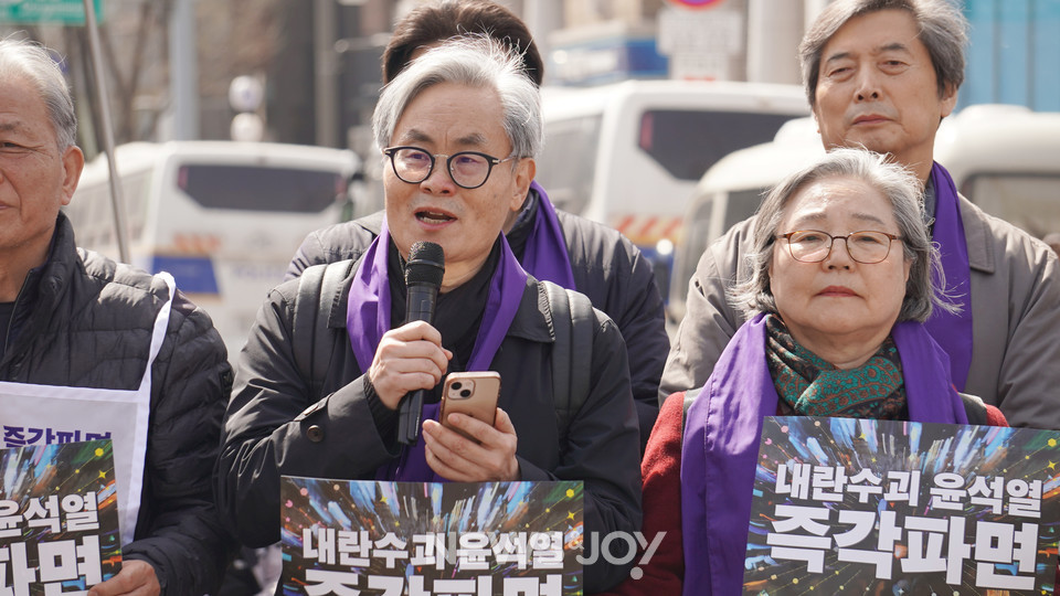 진광수 목사(기독교시국행동 상임대표)는 "윤석열 석방으로 기득권 카르텔의 최후 발악이 시작됐다. 내란 공범 국민의힘은 물론 사법부·검찰·언론·종교 세력이 총망라해 헌재를 압박하고 있다. 지금 우리는 민주주의와 파시즘의 갈림길에 서 있다. 이 나라를 극우 파시스트에게 결코 넘겨줄 수 없다"면서 "윤석열 파면은 헌재가 아닌 바로 이곳 우리가 모여 있는 광장에 답이 있다. 역사는 어떠한 방해에도 마침내 진보할 것"이라고 말했다.