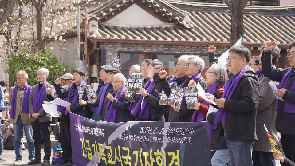 [뉴스앤조이-엄태빈 기자] 헌법재판소가 윤석열 대통령 탄핵 심판 변론 종결 후 한 달이 지나도록 선고일을 통지하지 않고 있는 가운데, 개신교 에큐메니컬 진영이 조속한 파면 결정을 촉구하고 나섰다. 한국기독교교회협의회시국회의·기독교시국행동·윤석열폭정종식그리스도인모임은 3월 26일 서울 종로구 경복궁역 인근에서 긴급 기자회견을 열고, 민주주의 회복을 위해 헌법재판소가 하루빨리 윤 대통령을 파면해야 한다고 했다.