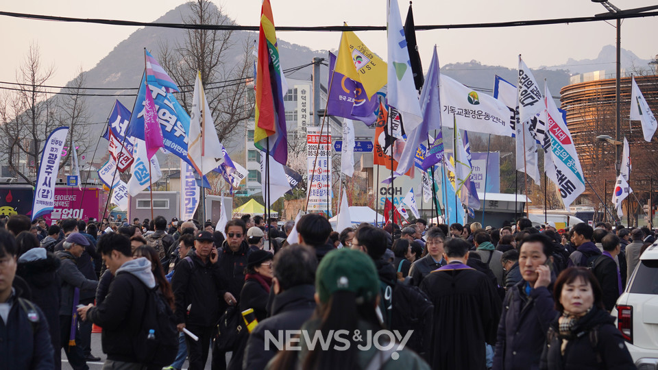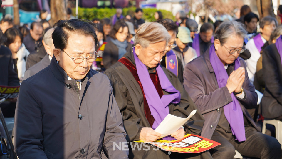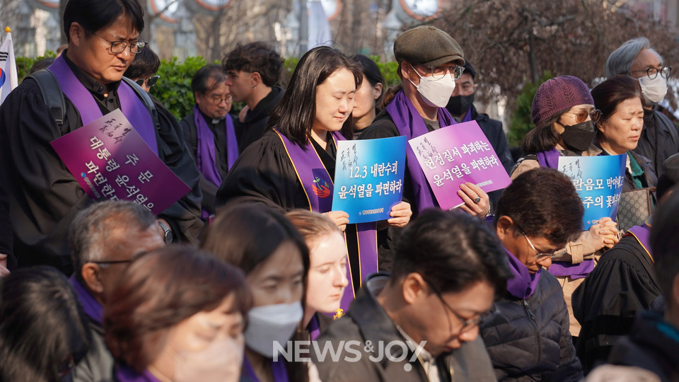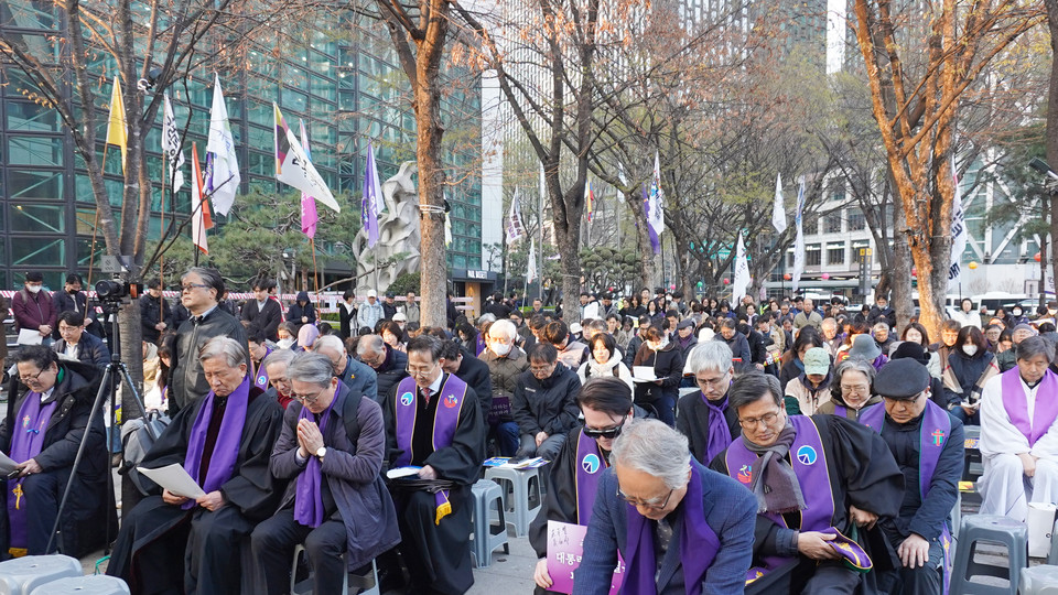 [뉴스앤조이-엄태빈 기자] 윤석열 대통령 탄핵심판 선고를 하루 앞둔 4월 3일, 서울 도심 일대에서는 주요 교단과 에큐메니컬 단체들이 연달아 시국 기도회를 열고 헌법재판소의 탄핵 인용 선고를 촉구했다.