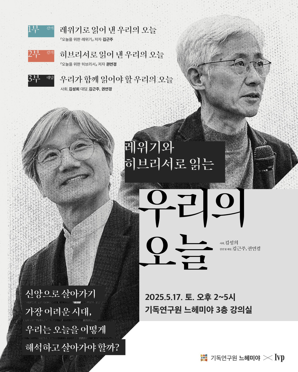 이번 강좌는 총 세 부분으로 구성했다. 1부에서는 <오늘을 위한 레위기>(IVP) 저자 김근주 교수(기독연구원느헤미야)가, 2부에서는 <오늘을 위한 히브리서>(IVP) 저자 권연경 교수(숭실대)가 각각 레위기와 히브리서로 우리 시대를 해석한다. 3부에서는 김성희 교수(기독연구원느헤미야)가 두 강사와 대담을 나누며 우리가 지금 마주하는 삶과 신앙을 깊이 있게 다룰 예정이다. 3부는 현장에서만 들을 수 있다.