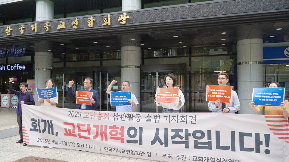 [뉴스앤조이-엄태빈 기자] 교회개혁실천연대(개혁연대·공동대표 김종미·남오성·박종운·임왕성)가 9월 12일 서울 종로구 한국기독교연합회관 앞에서 교단 총회 참관 활동 출범 기자회견을 열었다. 참석자들은 △정치적 극우화 방치 △교단 내 권력 다툼 및 대형 교회 세습 용인 △목회자들의 성범죄 △교회의 차별과 혐오 △여성 없는 교단 총회 △청년 외면하는 무관심을 회개하라고 했다.
