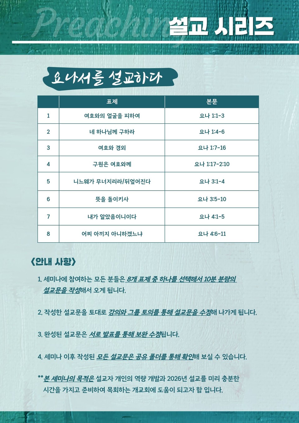 세미나는 설교 준비와 강단 적용 과정을 단계적으로 다루는 프로그램으로 구성된다. 특별히 요나서를 본문으로, 2026년 설교 시리즈 '요나서를 설교하다'(8주 과정)를 실제로 준비하는 프로그램이 진행된다. 설교 초안을 작성하며 상호 피드백을 나누는 과정을 통해 교회 현장에서 활용 가능한 설교안을 마련한다.