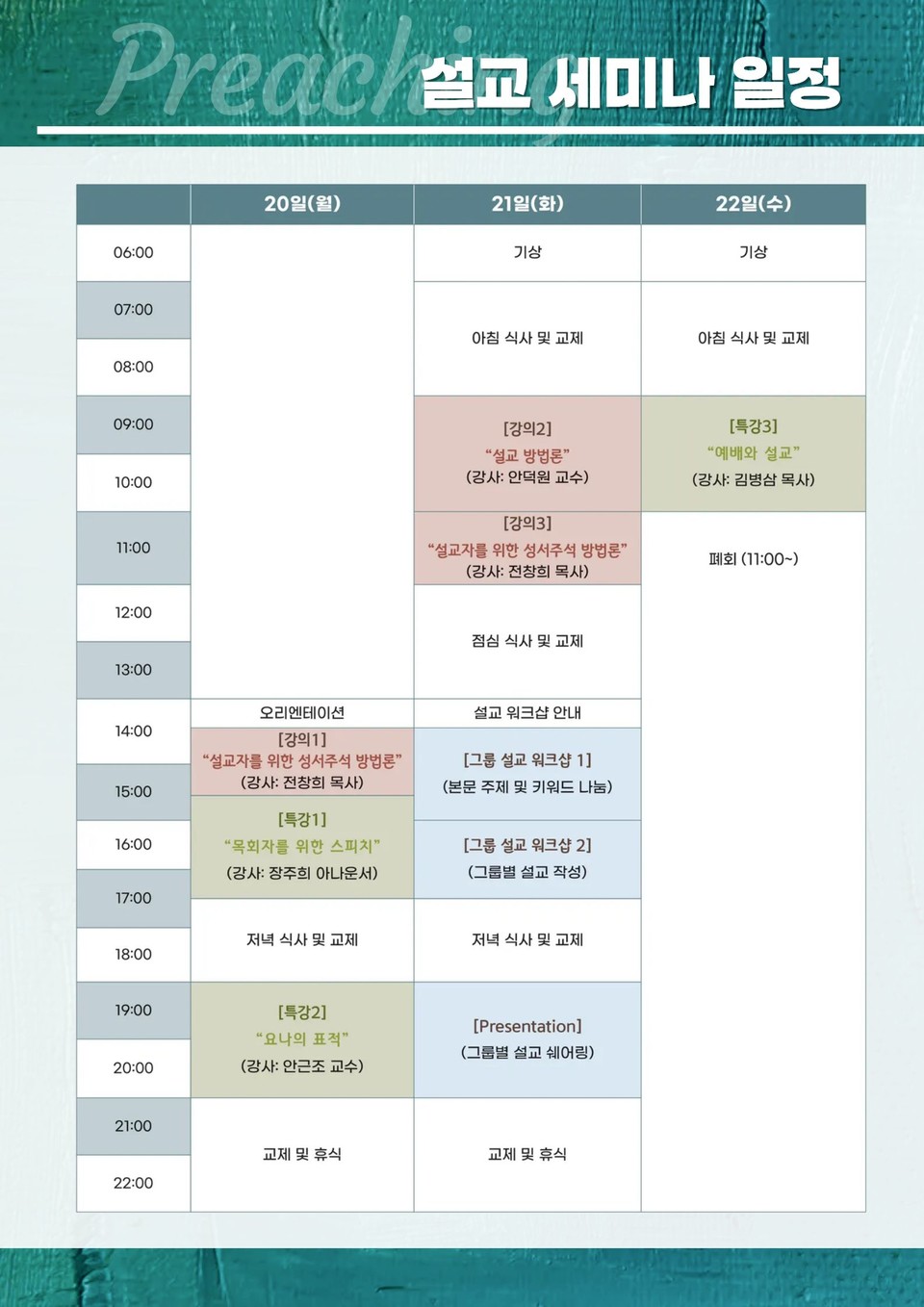 강사진은 전창희 목사(종교교회), 안덕원 교수(횃불트리니티신학대학원), 장주희 아나운서(CBS), 안근조 교수(호서대 기독교학과), 김병삼 목사(만나교회)이며, 강의 주제는 △성서 주석 방법론 △설교 방법론 △목회자를 위한 스피치 △요나의 표적 △예배와 설교 등이다.