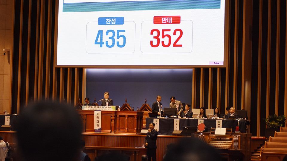 장봉생 총회장은 채용(판결 수용)과 환부(총회 재판국으로 돌려보내는 일) 여부를 두고 기립으로 표결을 진행했으나, 우열을 가리기 어렵다며 다시 전자 투표에 부쳤다. 표결 결과 787명 중 찬성 435표, 반대 352표로 판결이 그대로 확정됐다.