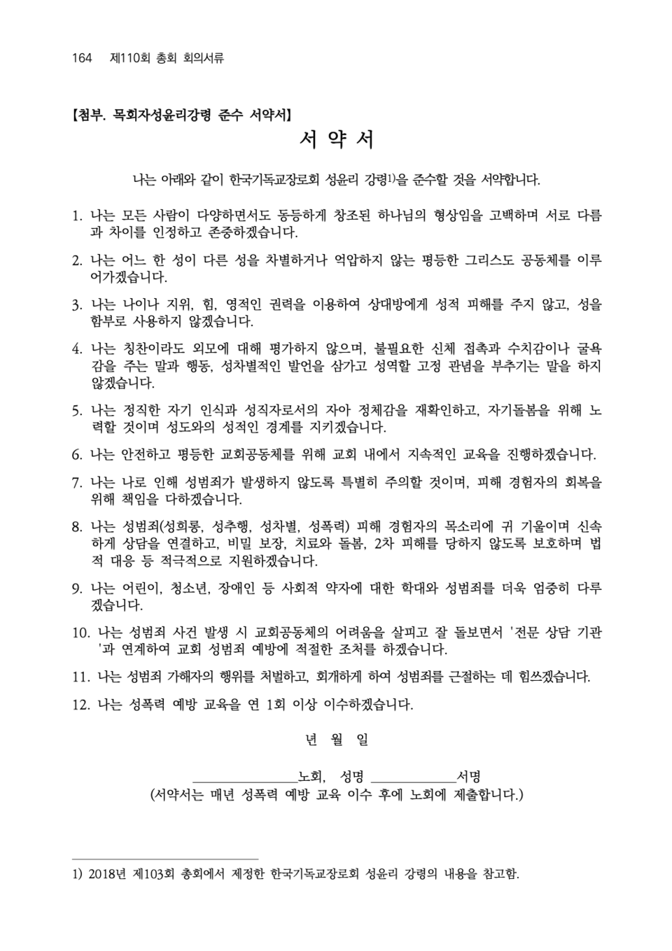 기장 양성평등위원회(양평위·안수경 위원장)는 이번 110회 총회에, 목회자 성 윤리 강령을 준수하도록 하는 서약서를 매년 1회 작성하는 방식으로 이행할 수 있게 달라고 헌의했다. 양평위는 지난해에도 이 안건을 올렸으나 '남성을 잠재적 가해자 취급한다', '매년 1회는 너무 엄격하다'는 등의 의견이 나와 3표 차이로 부결된 바 있다.