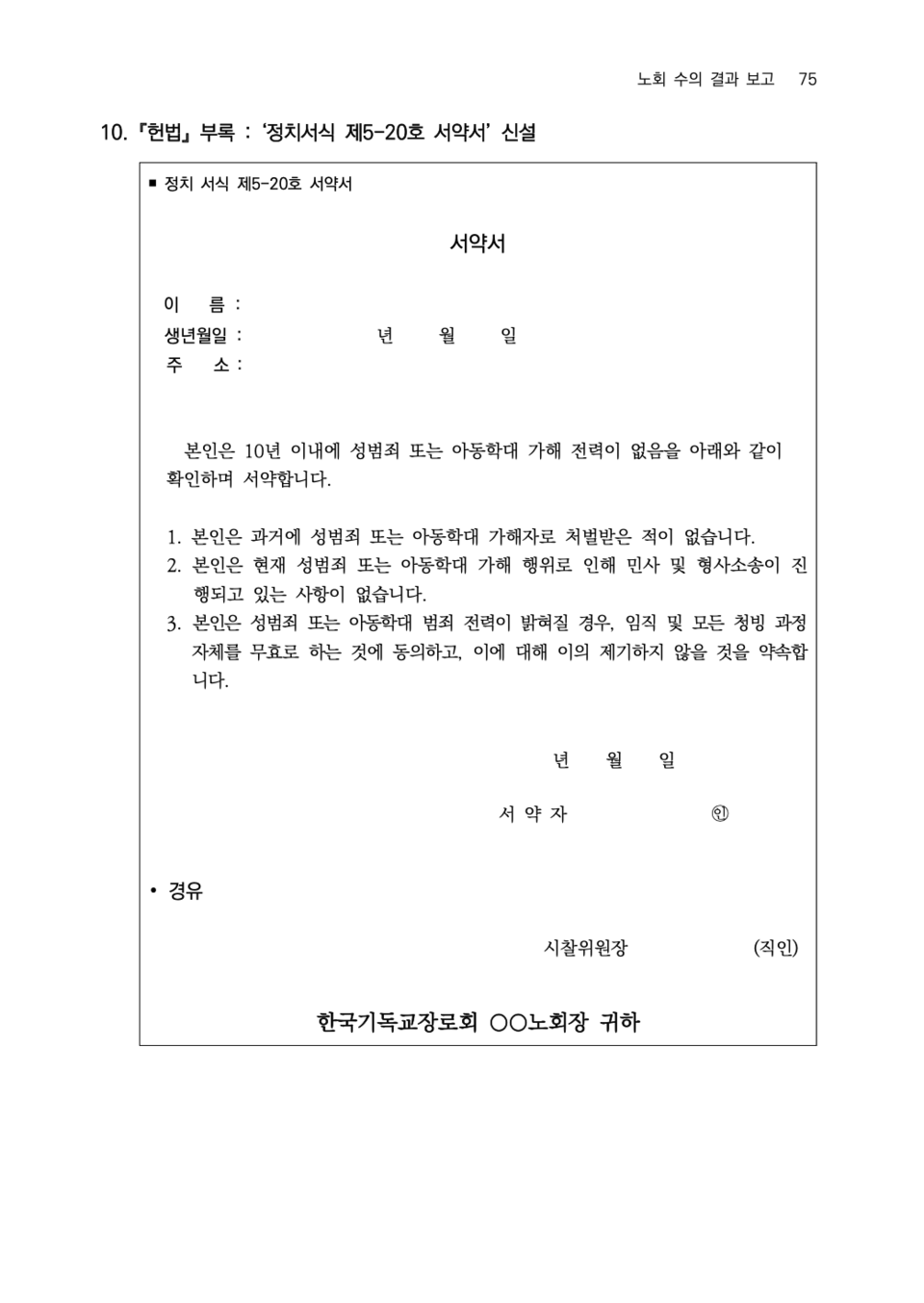 한편 기장은 지난해 총회에서 개정한 담임목사·부목사·기관목사 청빙·파송 및 신학생(목사후보생) 추천, 장로 임직 시 작성하는 성범죄 및 아동학대 전과가 없음을 증명하는 서약서도 전국 노회의 압도적인 지지로 수의 절차를 완료했다고 보고했다. "지난 10년간 과거에 성범죄 또는 아동학대 가해자로 처벌받은 적이 없으며, 이와 관련해 진행 중인 소송도 없고, 만일 관련 전력이 밝혀지면 임직 등 모든 청빙 과정 자체를 무효로 하기로 동의한다"는 내용으로, 헌법 공포 후 시행할 예정이다.